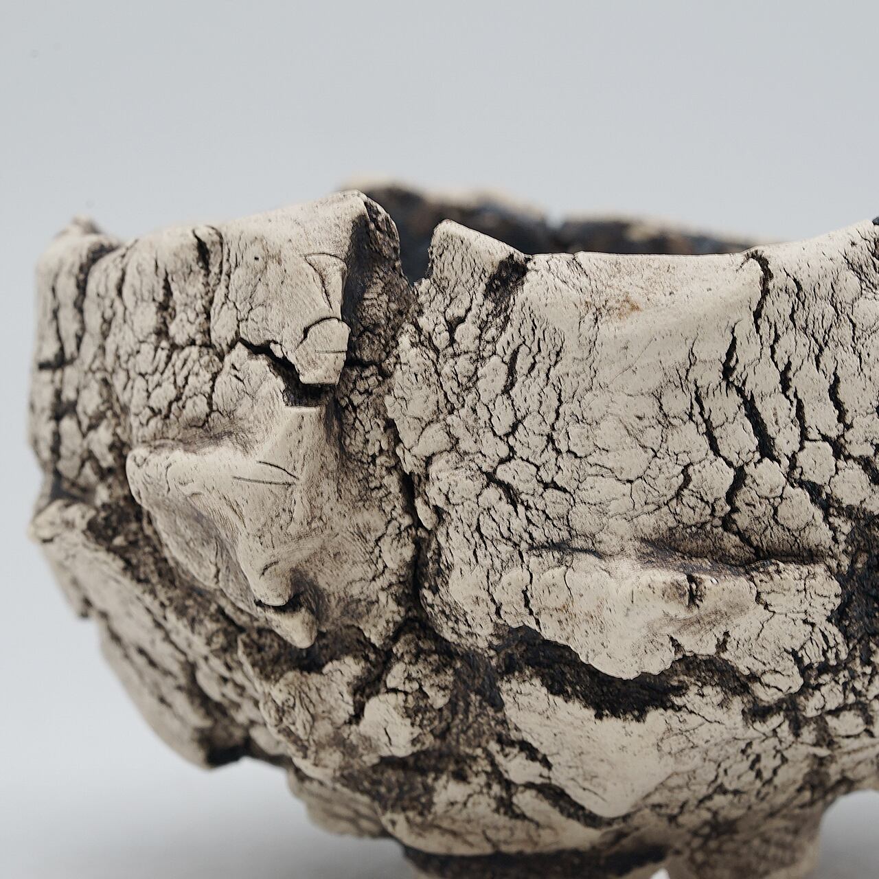 テクスチャはサイの顔に刻まれる筋や皮膚のシワ(48)感にフォーカスし、デザインは勢いに任せて成形した個性あるアシンメトリーな無骨さを表現した作品です。
