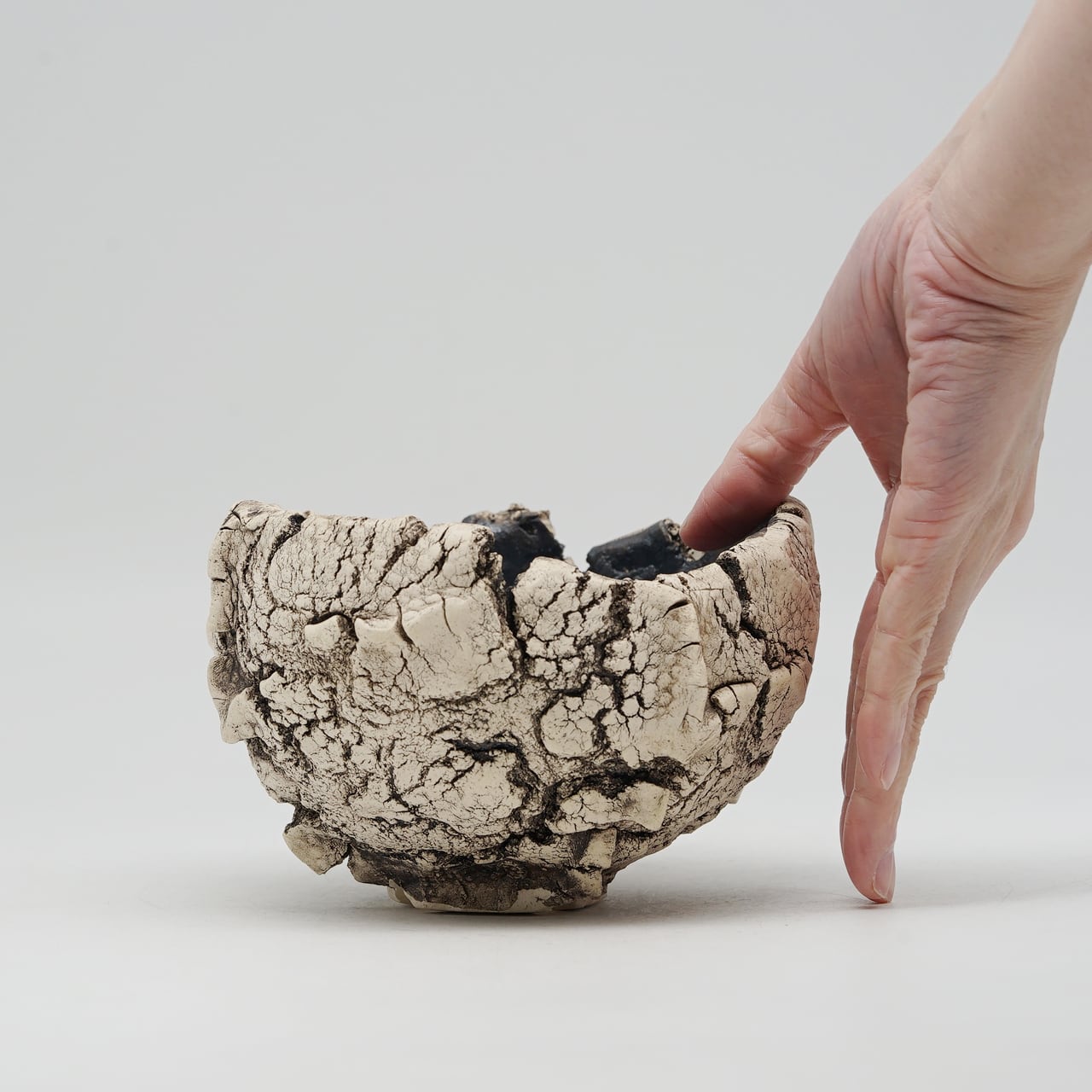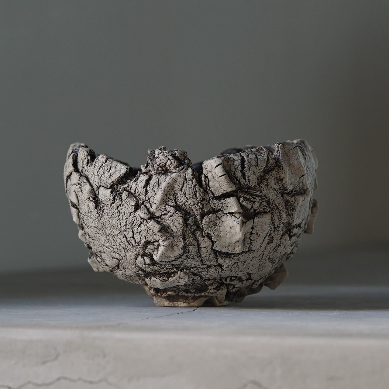 テクスチャはサイの顔に刻まれる筋や皮膚のシワ(48)感にフォーカスし、デザインは勢いに任せて成形した個性あるアシンメトリーな無骨さを表現した作品です。