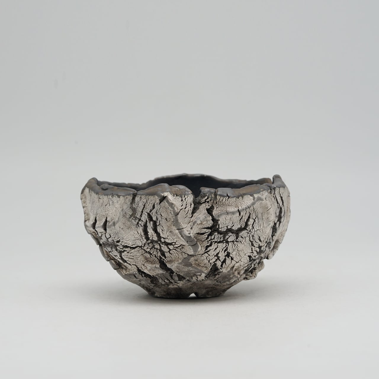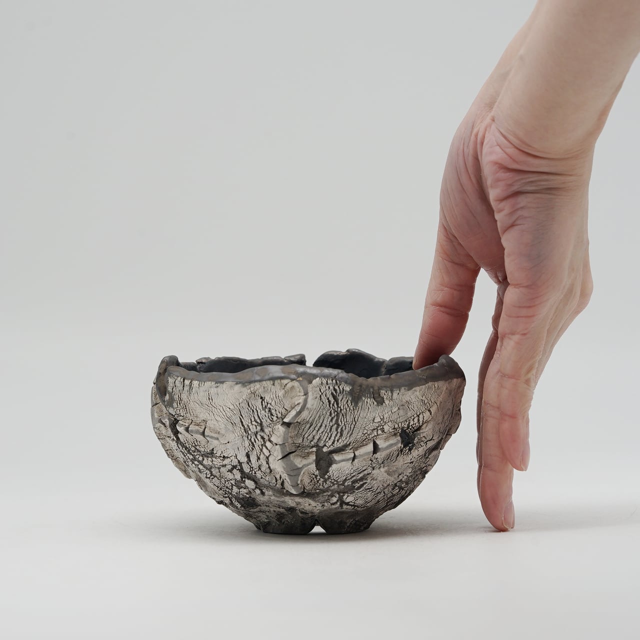 テクスチャはサイの顔に刻まれる筋や皮膚のシワ(48)感にフォーカスし、デザインは勢いに任せて成形した個性あるアシンメトリーな無骨さを表現した作品です。